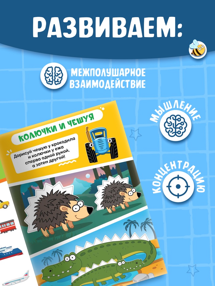 Задания в книге сделаны так, чтобы ребёнок мог тренировать обе руки одновременно, выполняя симметричные и асимметричные упражнения. Это способствует формированию межполушарных связей, что полезно для общего развития мозга. Маркеры легко стираются, поэтому малыш сможет экспериментировать и повторять задания много раз.