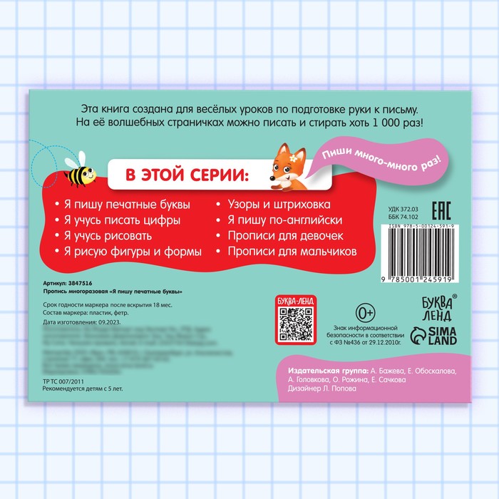 Многоразовая пропись «Пиши-стирай. Я пишу печатные буквы», 12 стр., с маркером — Характеристики