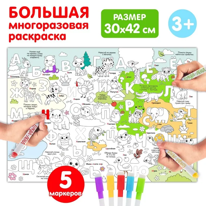 Многоразовая раскраска «Алфавит» — это увлекательный способ освоить алфавит и развить творческие навыки. Благодаря глянцевому покрытию ребёнок сможет раскрашивать снова и снова, создавая свои уникальные истории с буквами и животными.