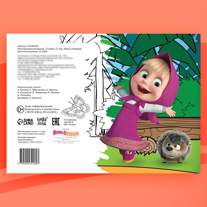 Многоразовая раскраска «Маша и Медведь», 17×24 см, 12 стр., с маркерами — Характеристики