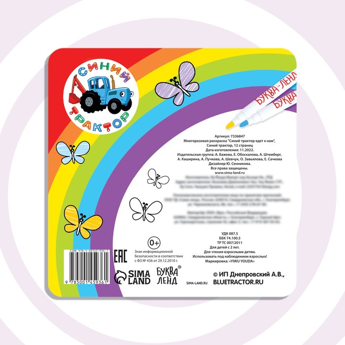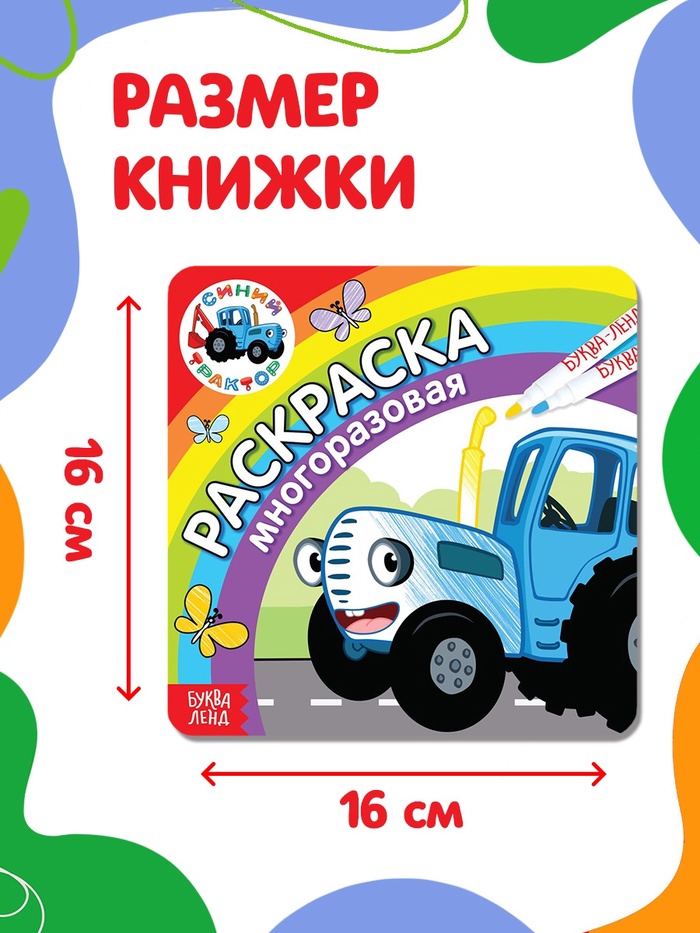 Многоразовая раскраска «Синий трактор едет к нам», 12 стр., 16 × 16 см, Синий трактор — Характеристики