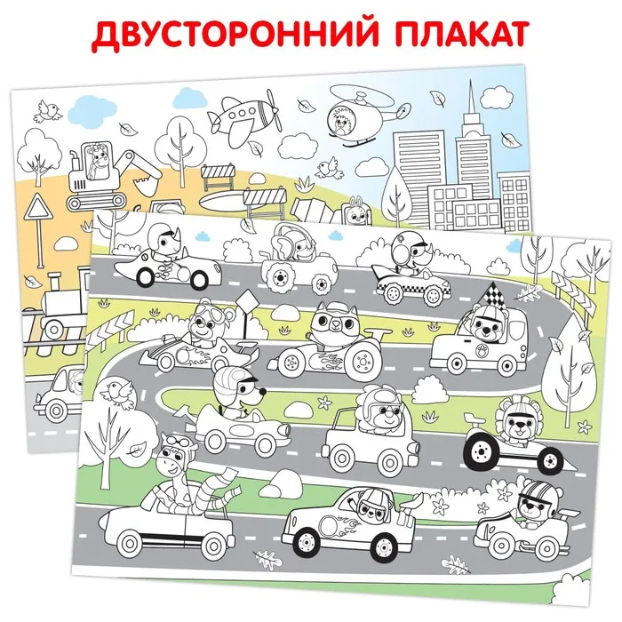 Раскрашивание помогает ребёнку развивать мелкую моторику, учиться различать цвета и формы, а также пробуждать воображение. Маркеры легко пишут на глянцевой поверхности, а их колпачки со стирателями позволяют быстро исправить ошибку или начать заново. Двусторонний формат даёт вдвое больше пространства для творческих экспериментов, превращая процесс в бесконечное приключение. Такие занятия не только тренируют руку, но и вдохновляют на создание собственных гоночных историй.
