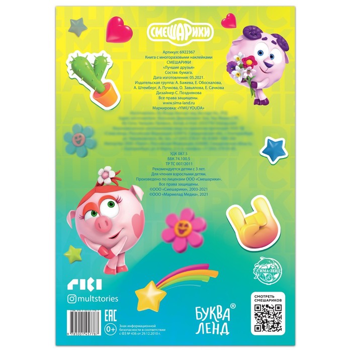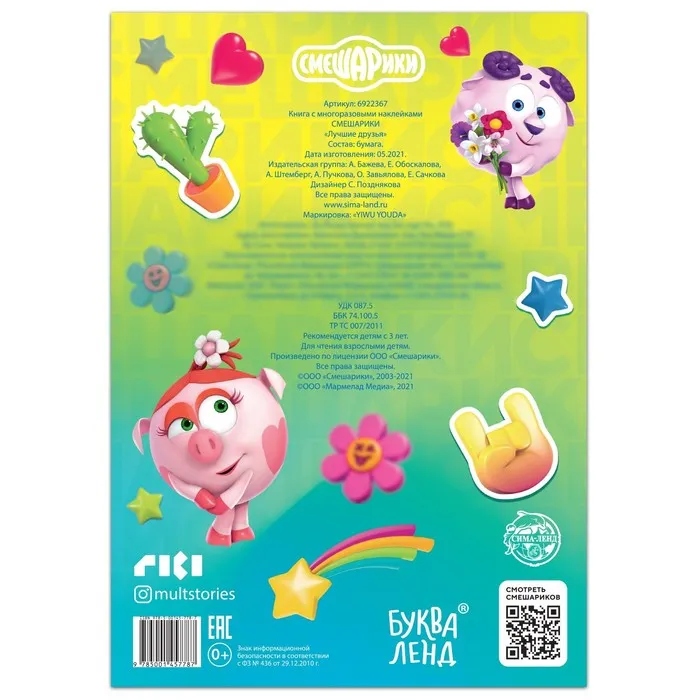 Многоразовые наклейки «Лучшие друзья» — это 4 страницы формата А4 с яркими персонажами Смешариков, которые можно многократно переклеивать. Мягкий переплёт и компактный размер делают альбом удобным для использования дома или в дороге.