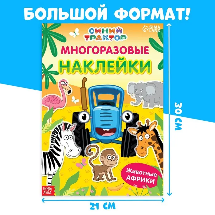 Набор наклеек «Животные Африки» — это возможность для ребёнка принять участие в невероятных приключениях Синего трактора. С помощью многоразовых наклеек можно украсить любой уголок внутри книги и помочь любимым героям в Африке.