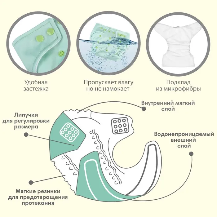Многоразовый подгузник Крошка Я, 3-15 кг, флис, светло-зеленый — Характеристики