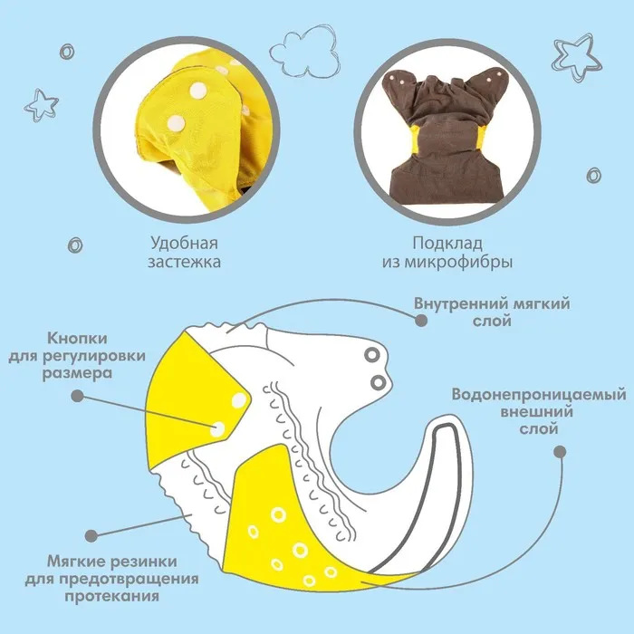 Многоразовый подгузник Крошка Я, 3-15 кг, угольно-бамбуковая ткань, желтый — Характеристики