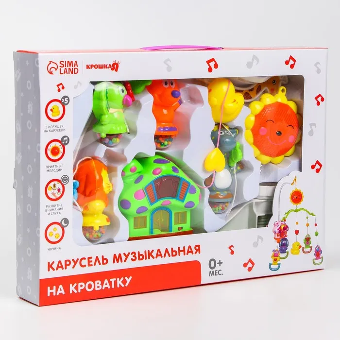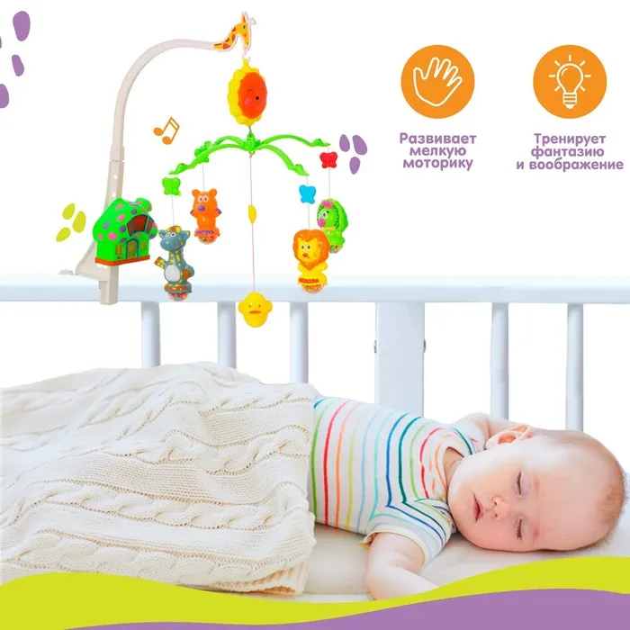 Вращающаяся музыкальная карусель поможет убаюкать малютку. Во время бодрствования грудничок будет с интересом наблюдать за движением весёлых фигурок, научится распознавать звуки, цвета и формы. Подросший малыш начнёт тянуться ручками к игрушкам: так ребёнок тренирует координацию движений и пробует оценивать расстояние до предметов.