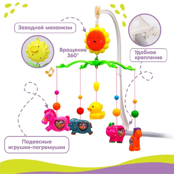 Мобиль музыкальный на кроватку Крошка Я «Солнышко. Зоопарк», заводной, виды МИКС — Характеристики