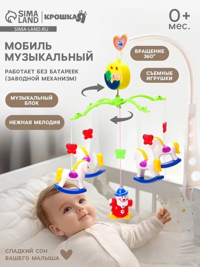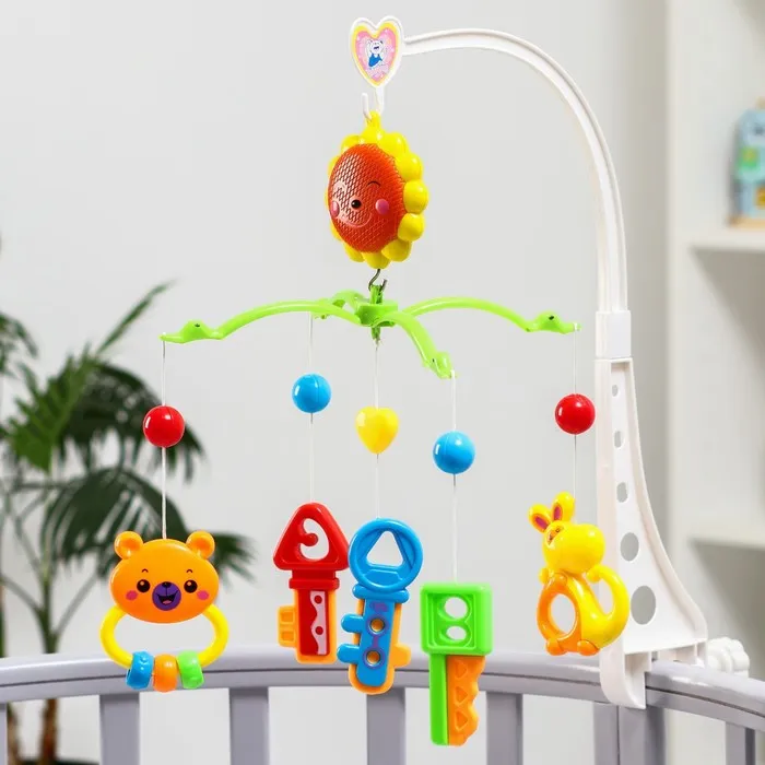 Мобиль на кроватку, проигрывающий колыбельные мелодии, отличная игрушка и подарок для малыша от 0 мес. Его можно прикрепить с помощью кронштейна, который идет в комплекте, на кроватку или коляску. Основа с игрушками вращается на 360 градусов. Все погремушки съемные, ими можно играть по отдельности, а также их очень удобно мыть.