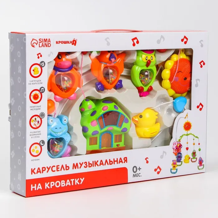 Вращающаяся музыкальная карусель поможет убаюкать малютку. Во время бодрствования грудничок будет с интересом наблюдать за движением весёлых фигурок, научится распознавать звуки, цвета и формы. Подросший малыш начнёт тянуться ручками к игрушкам: так ребёнок тренирует координацию движений и пробует оценивать расстояние до предметов.