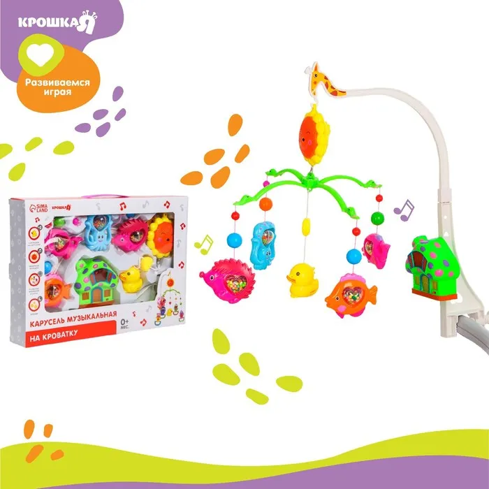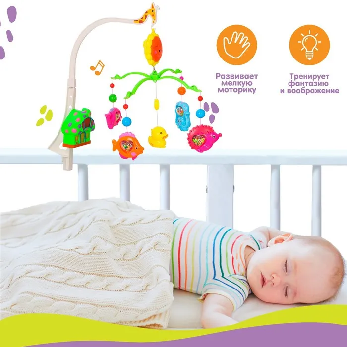 Вращающаяся музыкальная карусель поможет убаюкать малютку. Во время бодрствования грудничок будет с интересом наблюдать за движением весёлых фигурок, научится распознавать звуки, цвета и формы. Подросший малыш начнёт тянуться ручками к игрушкам: так ребёнок тренирует координацию движений и пробует оценивать расстояние до предметов.