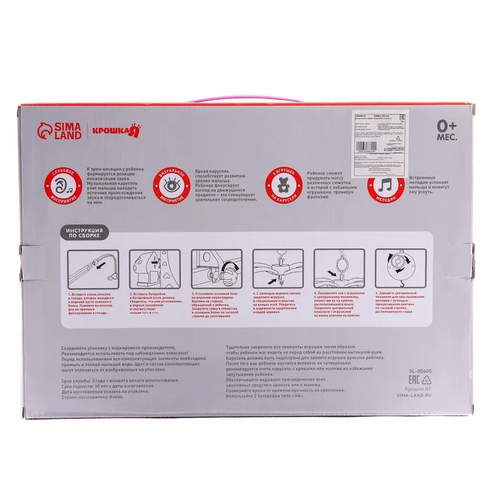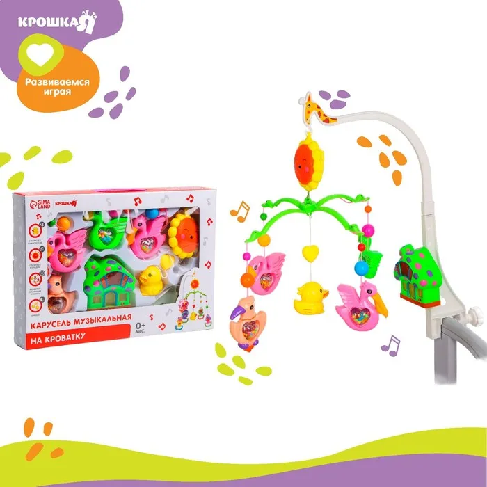 Вращающаяся музыкальная карусель поможет убаюкать малютку. Во время бодрствования грудничок будет с интересом наблюдать за движением весёлых фигурок, научится распознавать звуки, цвета и формы. Подросший малыш начнёт тянуться ручками к игрушкам: так ребёнок тренирует координацию движений и пробует оценивать расстояние до предметов.