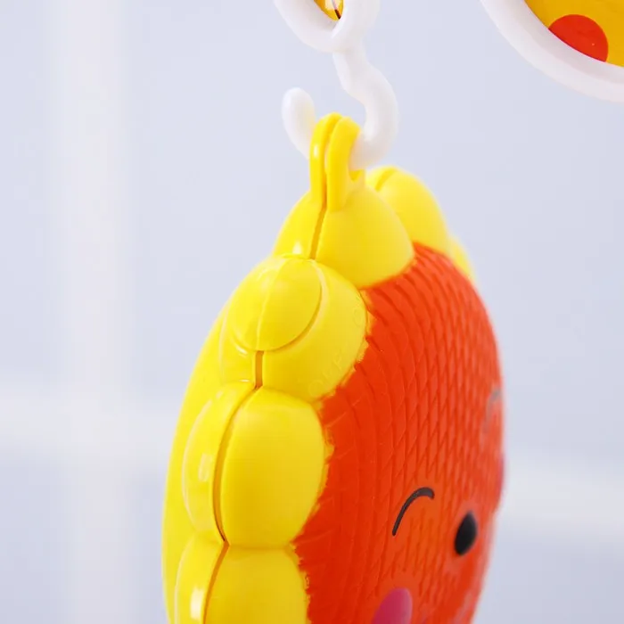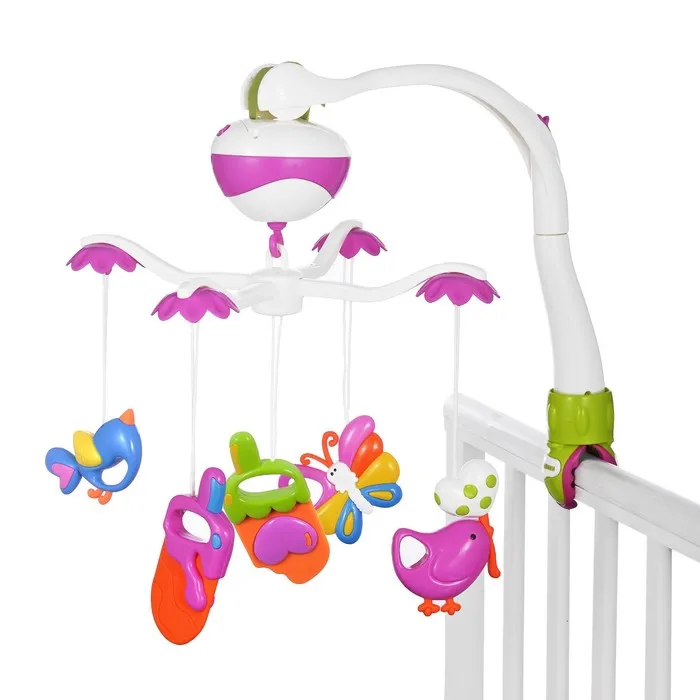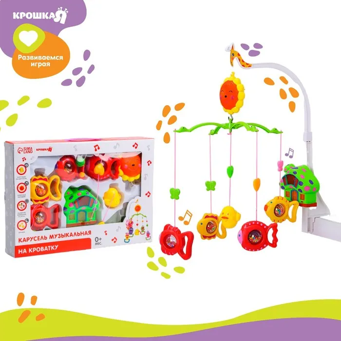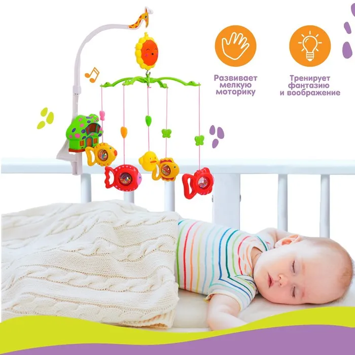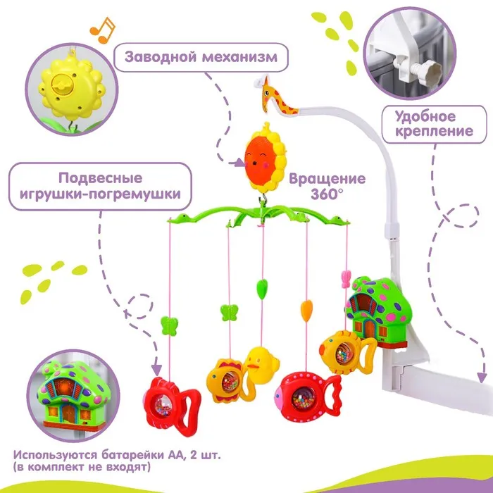 - 5 ярких игрушек над кроваткой медленно крутятся, привлекая внимание ребёнка. Их можно снять и использовать отдельно для игры.