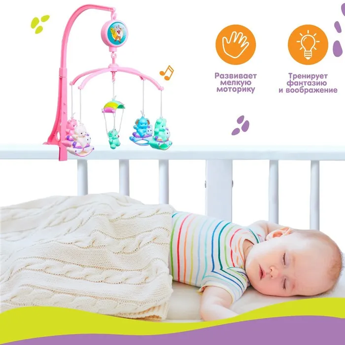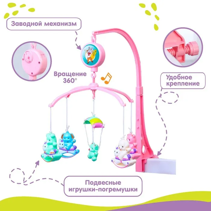 Мобиль музыкальный на кроватку «Зверюшки на качалке», заводной, наклейка МИКС — Характеристики