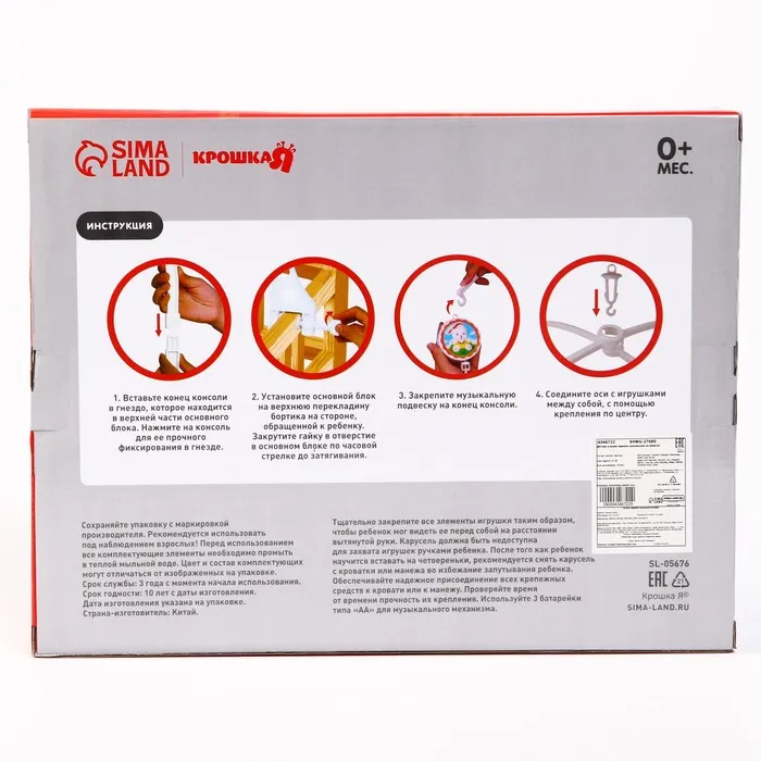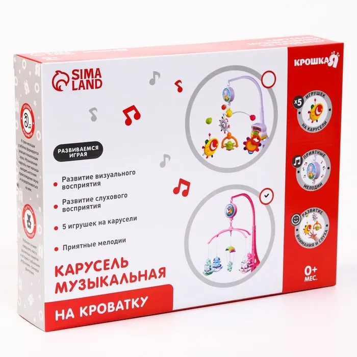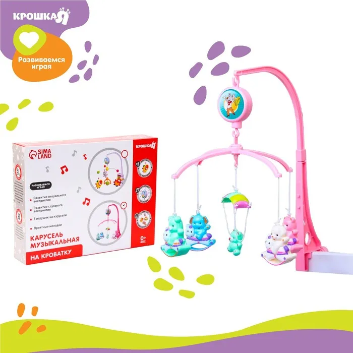 Вращающаяся музыкальная карусель поможет убаюкать малютку. Во время бодрствования грудничок будет с интересом наблюдать за движением весёлых фигурок, научится распознавать звуки, цвета и формы. Подросший малыш начнёт тянуться ручками к игрушкам: так ребёнок тренирует координацию движений и пробует оценивать расстояние до предметов.
