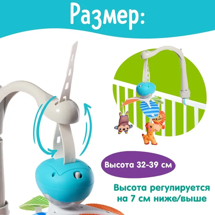 Игрушки на мобиле не только занимают ребёнка, но и помогают развивать координацию движений и зрительное внимание. Мелодия, звучащая во время работы устройства, оказывает успокаивающее воздействие, помогая малышу быстрее заснуть. Мобиль можно быстро установить на любую стандартную кроватку, а простое управление не требует сложных действий.
