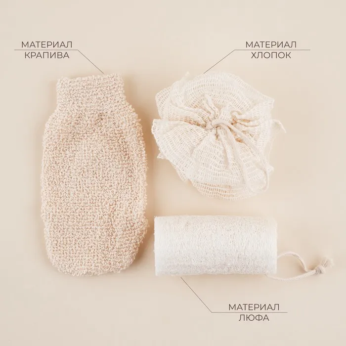 Мочалки для ванной SL Home «Ортика», 3 мочалки, розочка, варежка, люффа, бежевые — Характеристики
