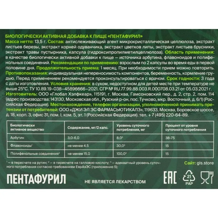 Мочегонное средство в таблетках «Пентафурил», от отёков тела и лица, 30 капсул по 350 мг — Характеристики