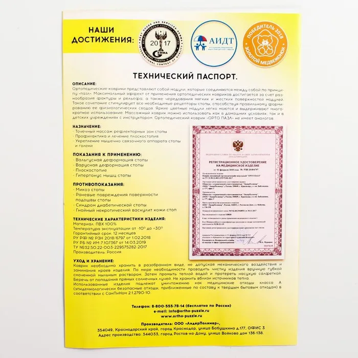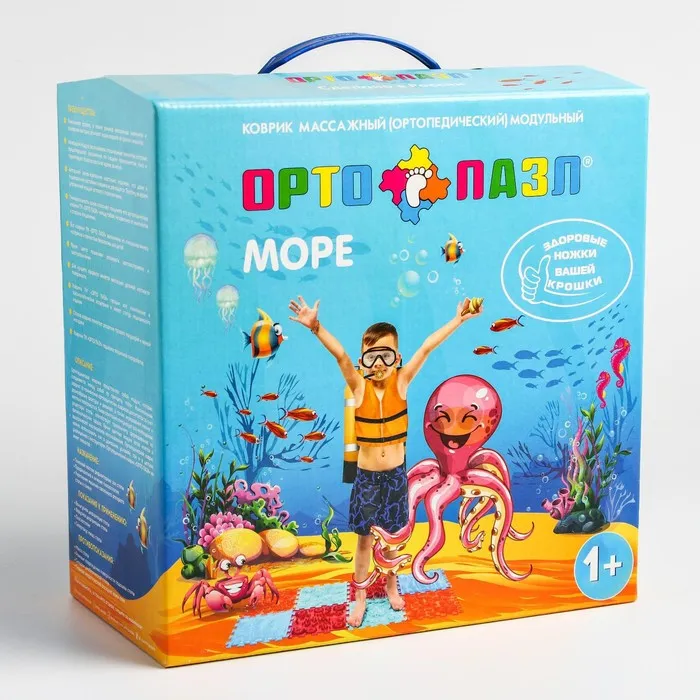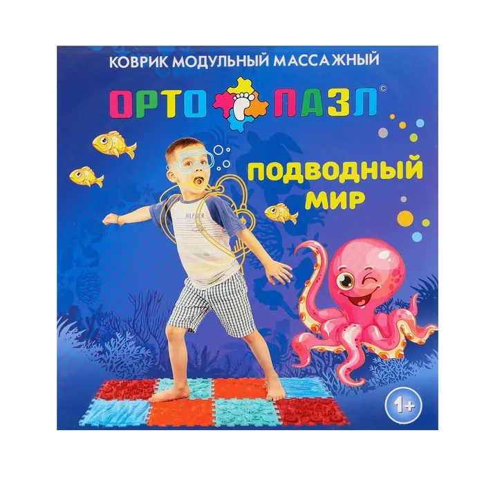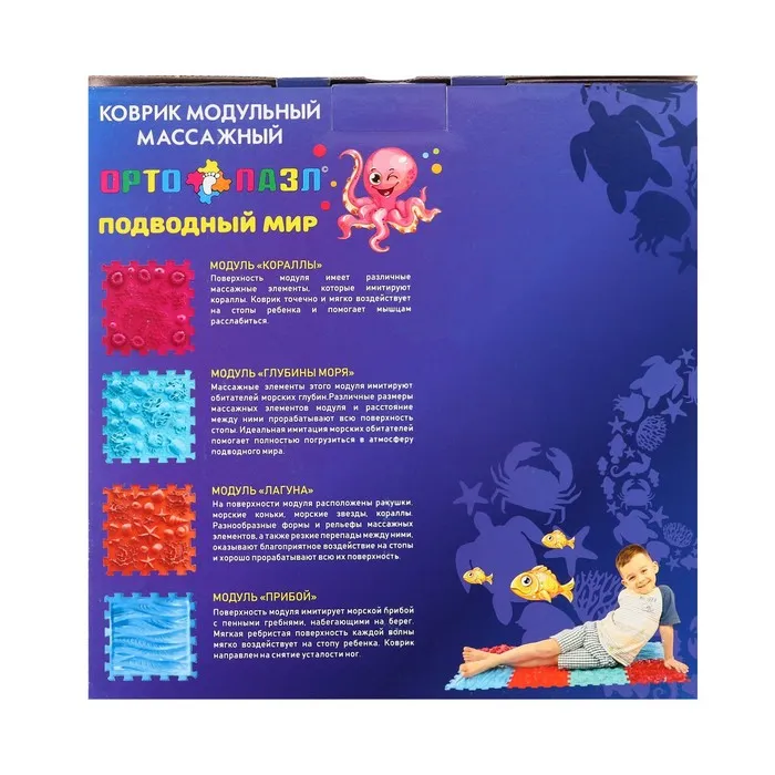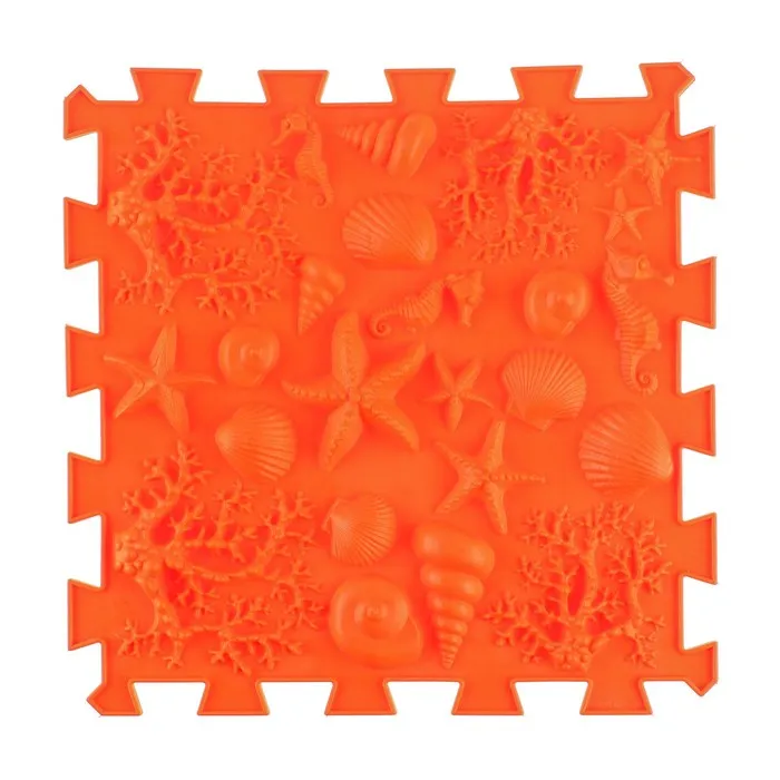 Детский массажный коврик состоит из отдельных модулей, которые соединяются между собой по принципу пазла. Ребёнок сможет ходить по рельефному покрытию или выполнять упражнения, стоя на нём. Во время занятий стимулируются рецепторы стопы, формируются её физиологические своды, а также активизируется кровообращение и укрепляется связочный аппарат.