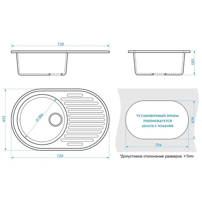 Мойка для кухни из камня ZEIN 11/Q8, 720 х 455 мм, овальная, перелив, цвет темно-серый — Характеристики
