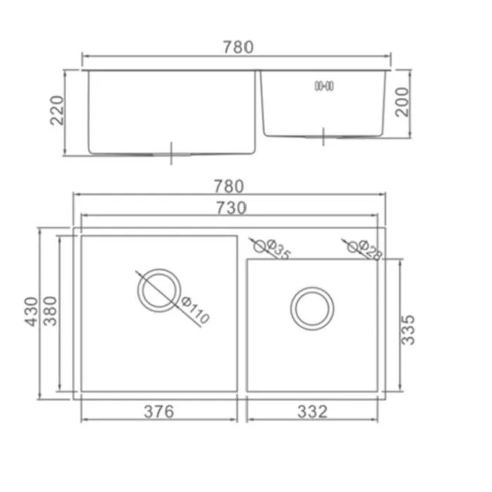 Мойка кухонная AFLORN AF97843B-D, врезная, двойная, S=3,0 и 0,8мм, 78х43х22см, сифон, графит — Характеристики