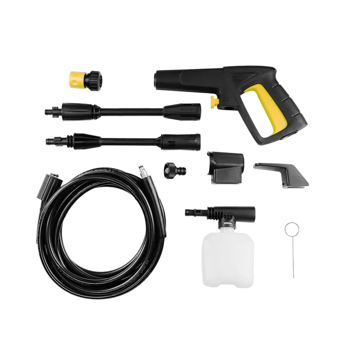 В комплекте с мойкой вы найдете все необходимые аксессуары для максимально эффективной и удобной работы: пистолет высокого давления, удлинитель для пистолета, распылитель, емкость для моющего средства, а также специальные насадки для различных задач очистки.