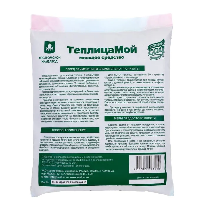 Моющее средство для теплиц ""Здоровый сад"" или ""ТеплицаМой"" поставляется в удобной упаковке весом 0,5 кг. Этого достаточно для нескольких мытьев теплицы или других стеклянных поверхностей.