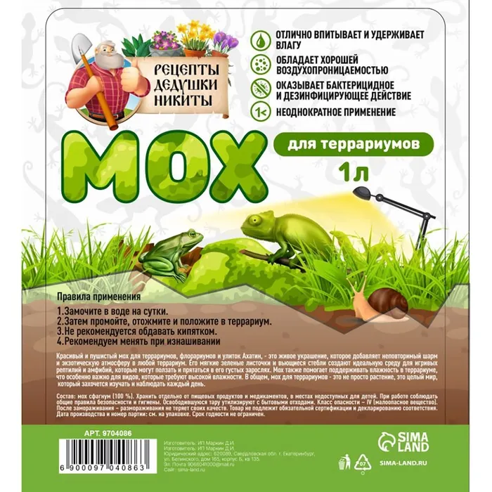 Мы гордимся качеством нашего мха и уверены, что он станет прекрасным дополнением к вашему домашнему террариуму. Создайте яркое и комфортное место для своих питомцев с мхом "Рецепты дедушки Никиты"!