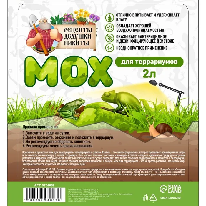 Мы гордимся качеством нашего мха и уверены, что он станет прекрасным дополнением к вашему домашнему террариуму. Создайте яркое и комфортное место для своих питомцев с мхом "Рецепты дедушки Никиты"!