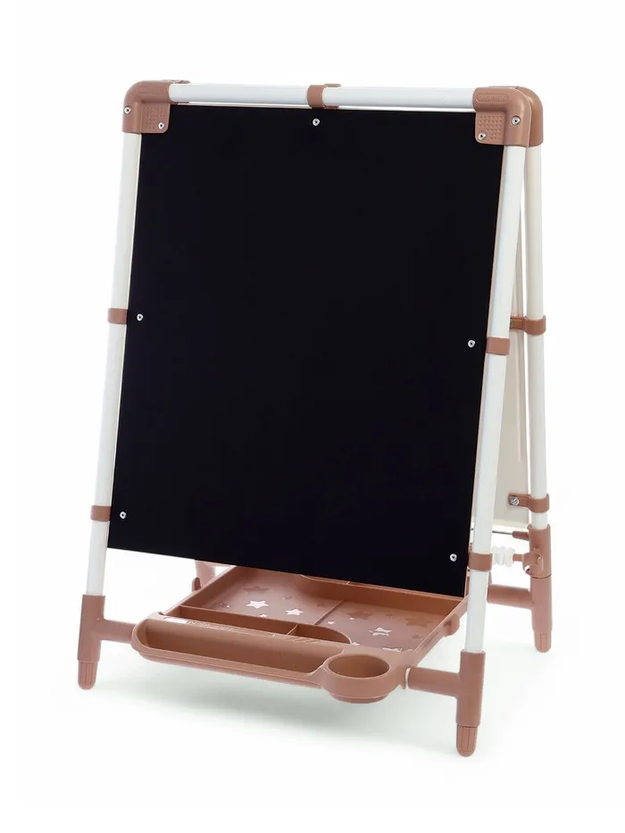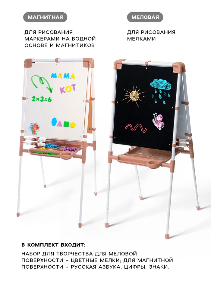 Детский мольберт с двумя рабочими сторонами станет отличным помощником в обучении и творчестве. Одна поверхность предназначена для рисования мелом, другая — для маркеров и магнитных игр. Удобная регулировка высоты позволяет подстроить доску под рост ребёнка, а вместительный органайзер поможет держать принадлежности в порядке.