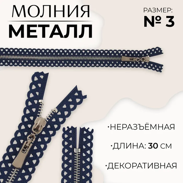 Молния металлическая, №3, неразъёмная, замок автомат, 30 см, тёмно-синяя — Характеристики