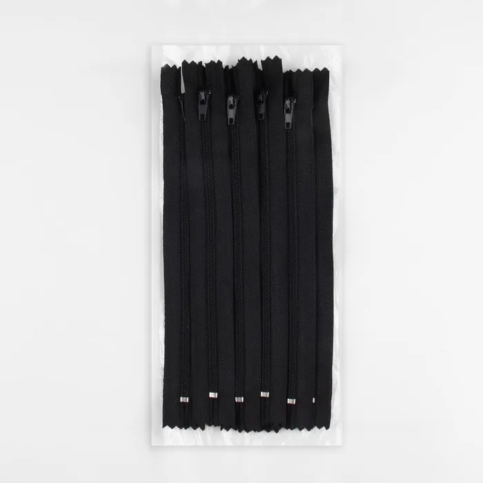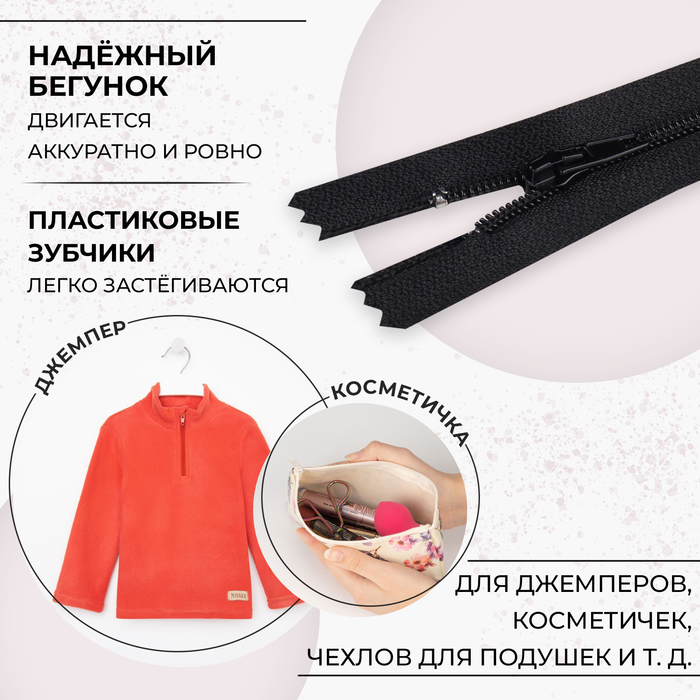 Бегунок плавно скользит по застёжке. Данная молния является неразъёмной, тесьма в нижней части закреплена. Номер молнии обозначает ширину зубчиков в миллиметрах.