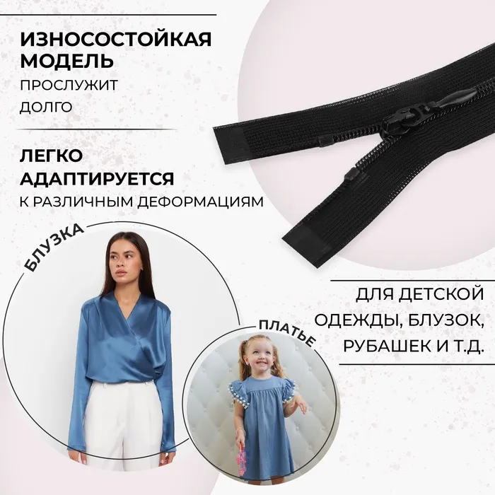 Бегунок плавно перемещается по зубчикам. Молния является разъёмной — замочек на конце полностью расстёгивается. Номер обозначает ширину зубчиков в миллиметрах. Данная молния является плательной, применяется для пошива блузок, сарафанов.