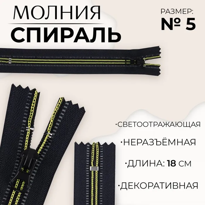 Молния «Спираль», №5, неразъёмная, светоотражающая, замок автомат, 18 см, чёрная, зелёная — Характеристики