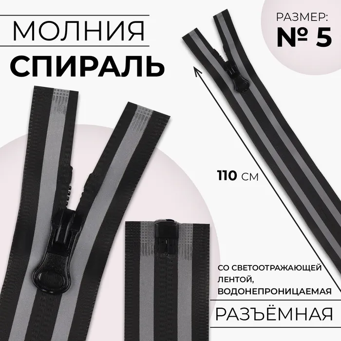 Молния «Спираль», №5, разъёмная, водонепроницаемая, со светоотражающей лентой, замок автомат, 110 см, цвет чёрный/серый, цена за 1 штуку — Характеристики