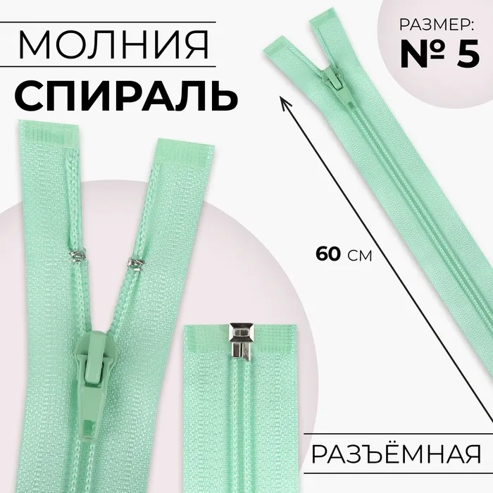 Молния «Спираль», №5, разъёмная, замок автомат, 60 см, светло-зелёная — Характеристики