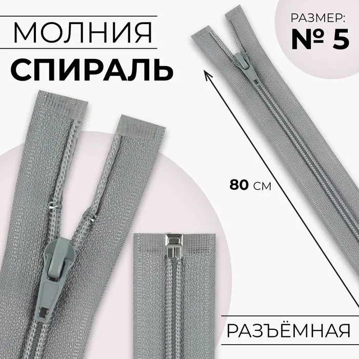 Молния «Спираль», №5, разъёмная, замок автомат, 80 см, светло-серая — Характеристики