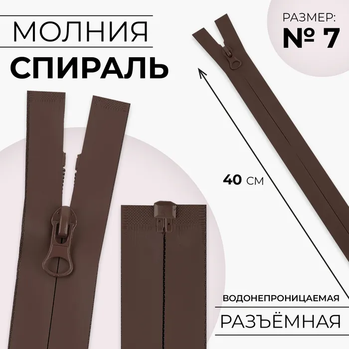 Молния «Спираль», №7, разъёмная, водонепроницаемая, замок автомат, 40 см, коричневая — Характеристики