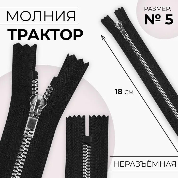 Молния «Трактор», №5, неразъёмная, декоративное звено «Акулий зуб», замок автомат, 18 см, чёрная — Характеристики
