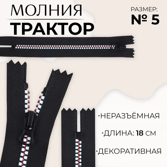 Молния «Трактор», №5, неразъёмная, замок автомат, 18 см, чёрная, белая, красная — Характеристики