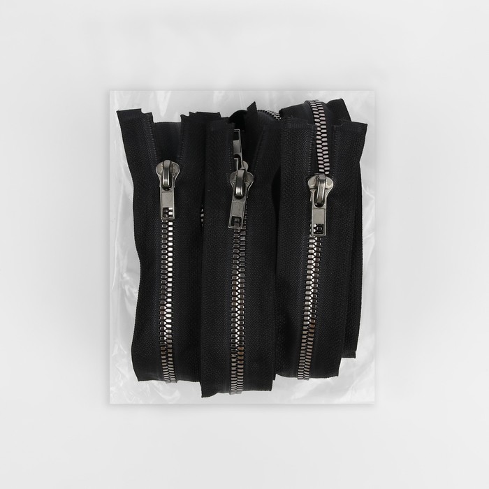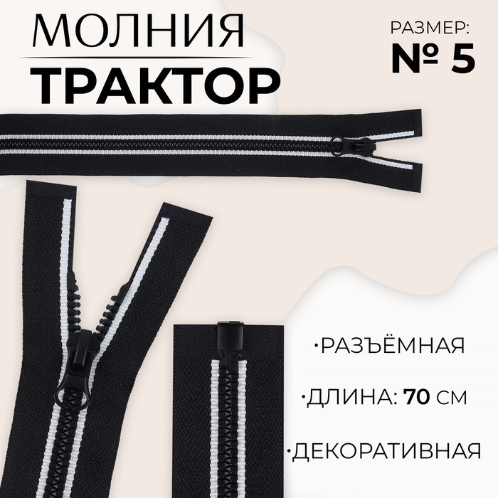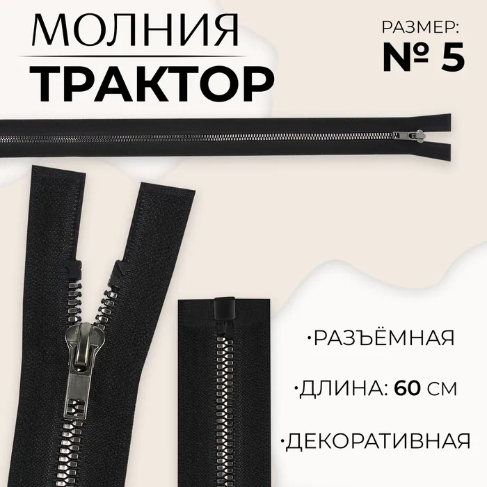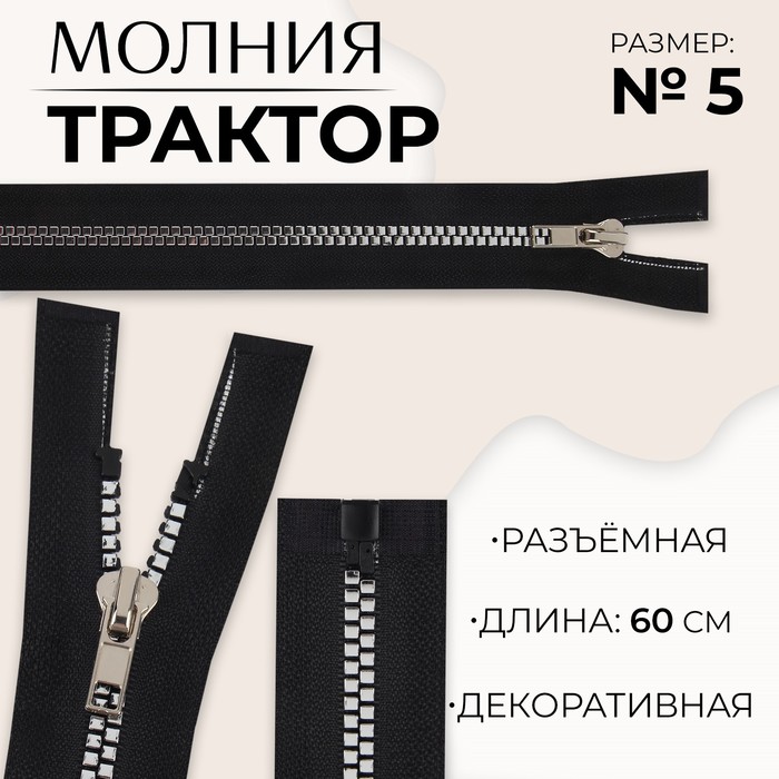 Молния «Трактор», №5, разъёмная, декоративное звено «Акулий зуб», замок автомат, 60 см, цвет чёрный/чёрный никель, цена за 1 штуку — Характеристики