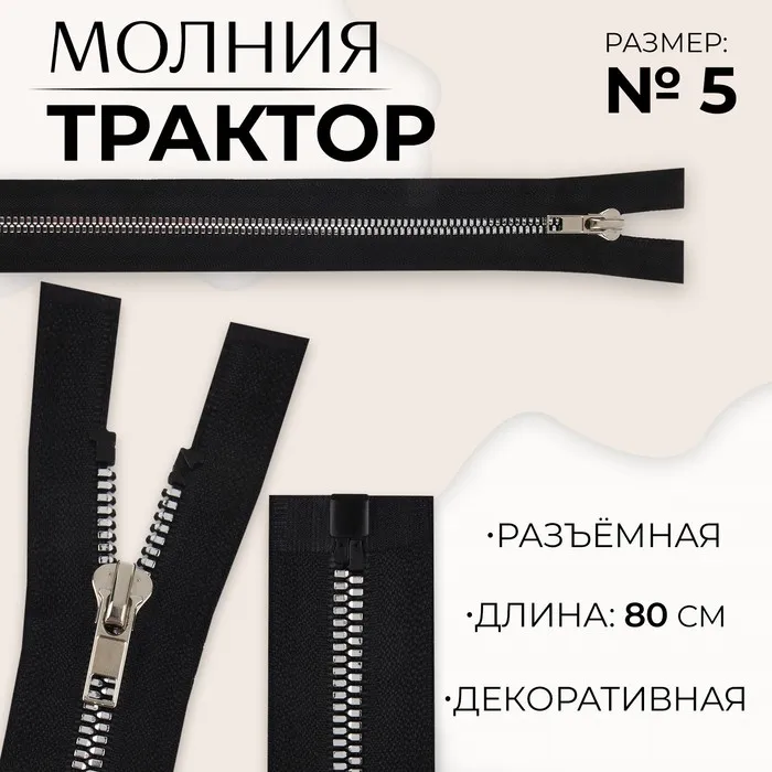 Молния «Трактор», №5, разъёмная, декоративное звено «Акулий зуб», замок автомат, 80 см, чёрная — Характеристики