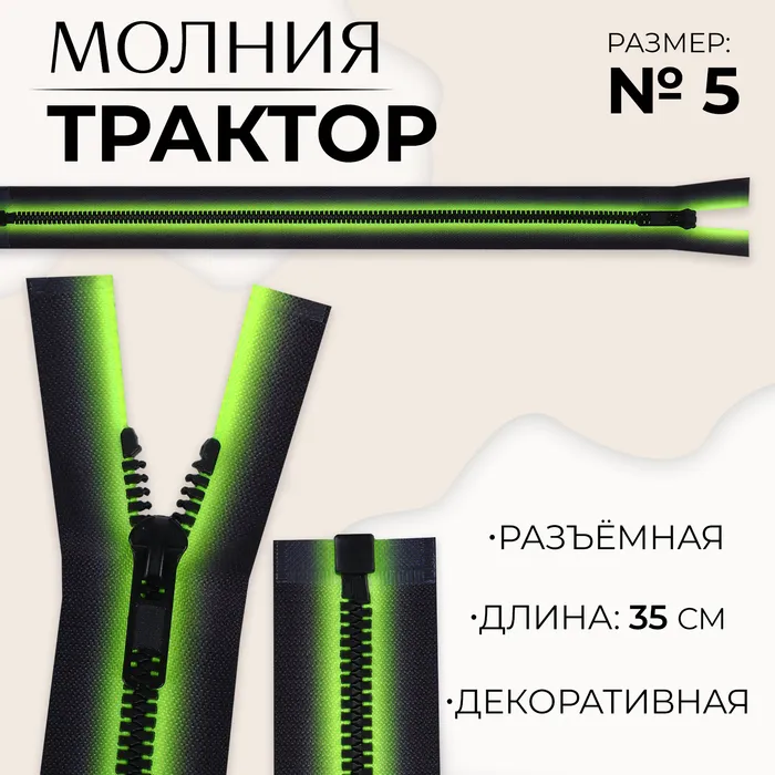 Молния «Трактор», №5, разъёмная, замок автомат, 35 см, зелёная, чёрная — Характеристики