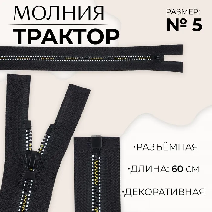 Молния «Трактор», №5, разъёмная, замок автомат, 60 см, чёрная, белая, жёлтая — Характеристики