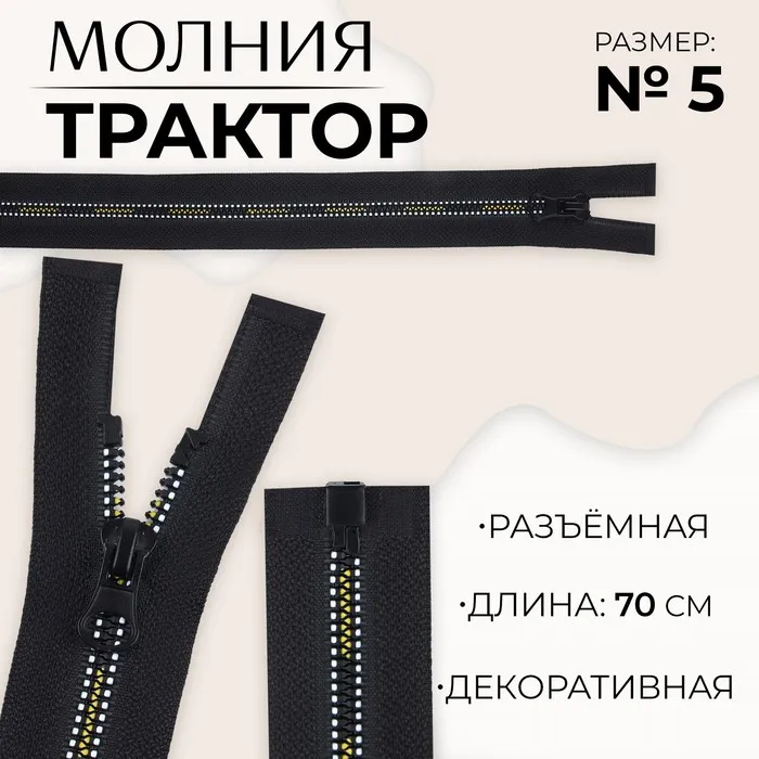 Молния «Трактор», №5, разъёмная, замок автомат, 70 см, чёрная, белая, жёлтая — Характеристики
