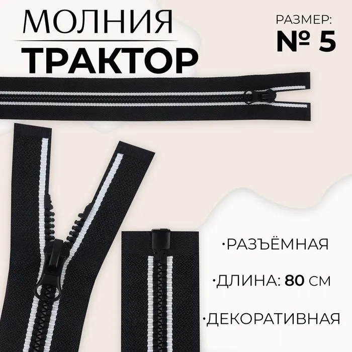Молния «Трактор», №5, разъёмная, замок автомат, 80 см, чёрная, белая — Характеристики