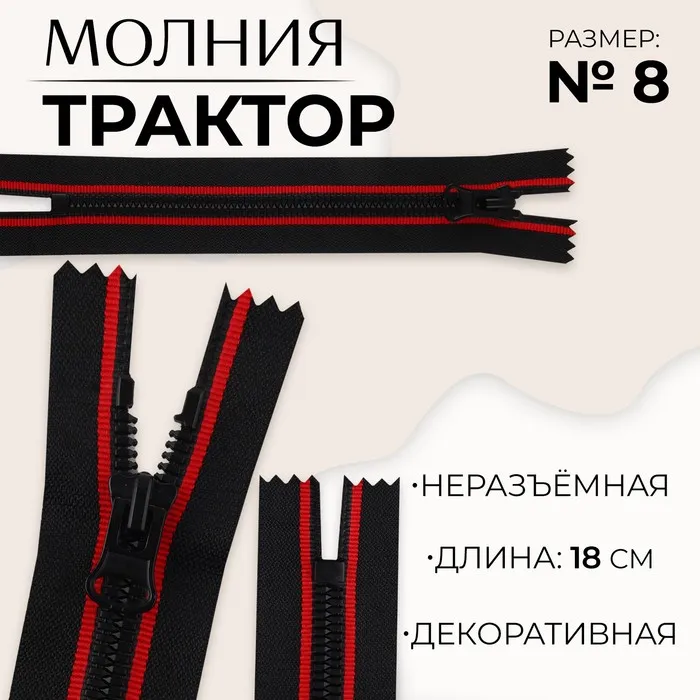 Молния «Трактор», №8, неразъёмная, замок автомат, 18 см, чёрная, красная — Характеристики