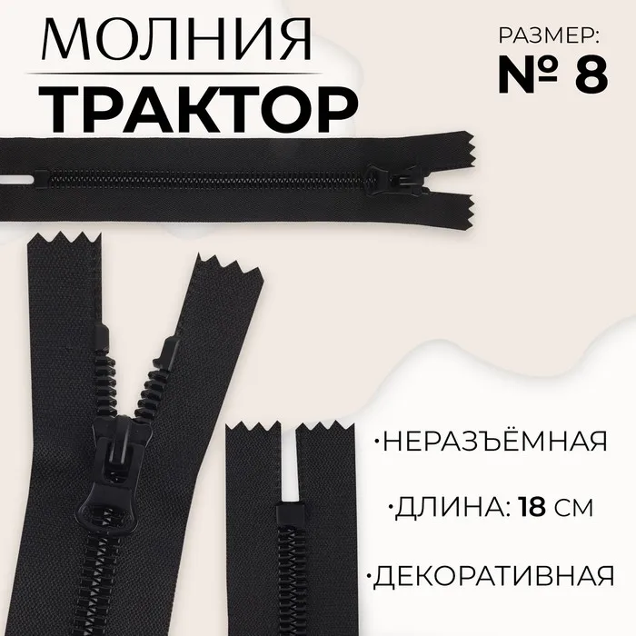 Молния «Трактор», №8, неразъёмная, замок автомат, 18 см, чёрная — Характеристики