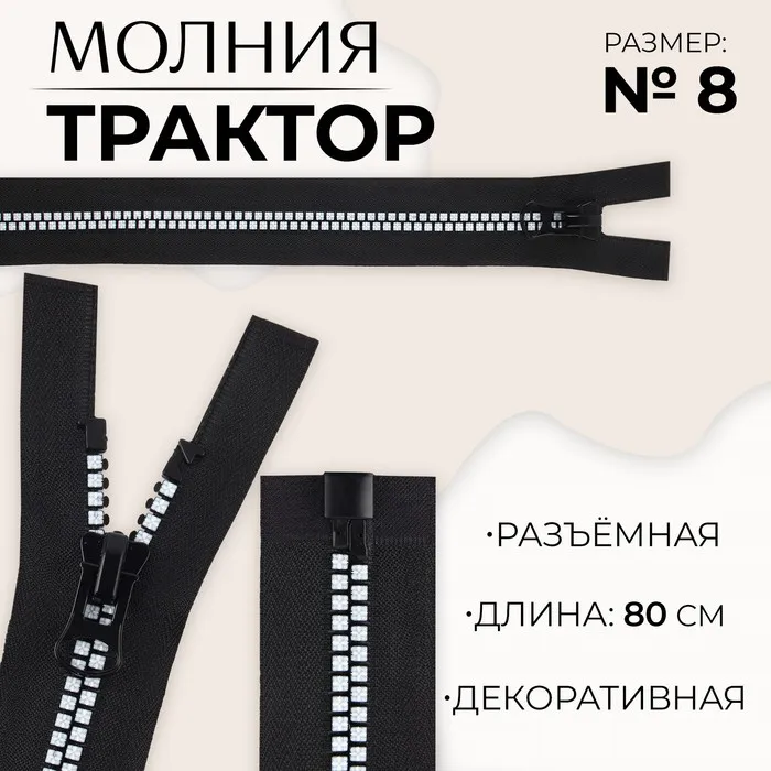 Молния «Трактор», №8, разъёмная, замок автомат, 80 см, чёрная, белая — Характеристики