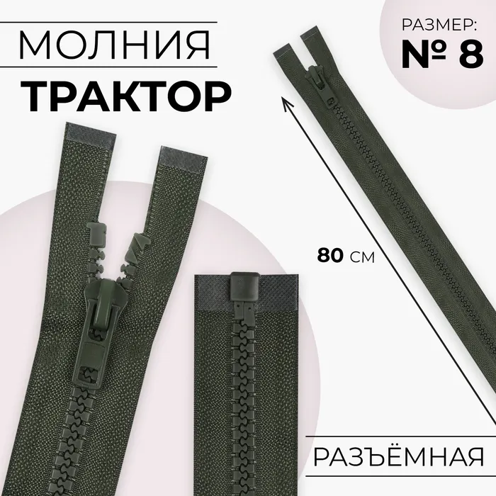 Молния «Трактор», №8, разъёмная, замок автомат, 80 см, хаки — Характеристики